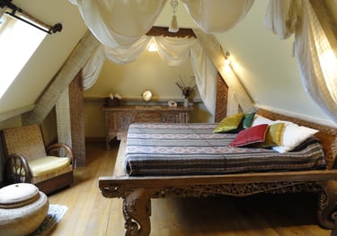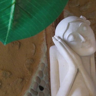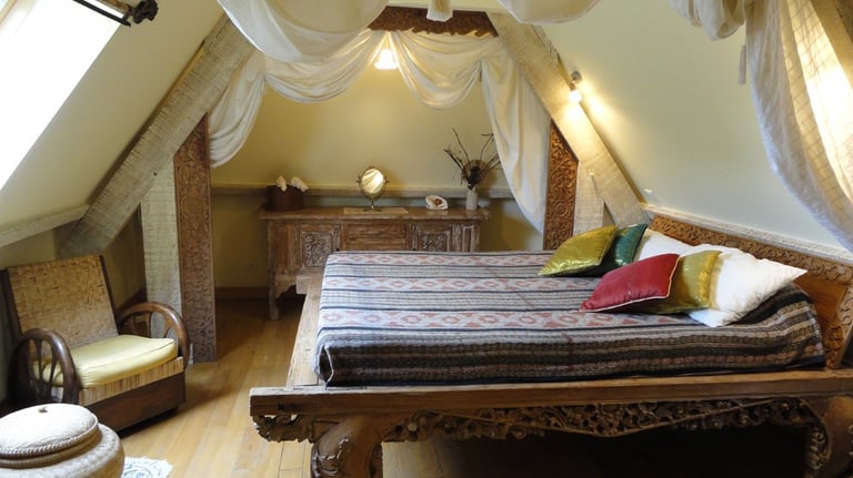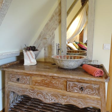 From the lounge a polished timber staircase leads up to a romantic main double bedroom with hand-made Balinese crafted bedroom furniture. The bedroom has a wash hand basin.