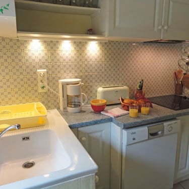 In the main house, ground floor accommodation includes a small, but fully equipped kitchen with 4-ring hob, fridge / freezer, dishwasher, toaster, drip coffee percolator, storage units and cutlery / utensils for 6 guests. The open-plan living / dining room has a lovely open log-burning fireplace and oil-fired central heating.